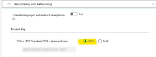 Sollten Sie KMS nicht auswählen können, prüfen Sie die ausgewählte Office-Version, hier darf nicht die SPLA-Variante ausgewählt werden.