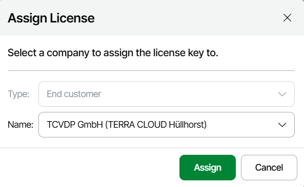 5. Wählen Sie die neue Lizenz aus der Liste der License Keys aus weisen Sie die Lizenz über die License Actions --> Assign zu