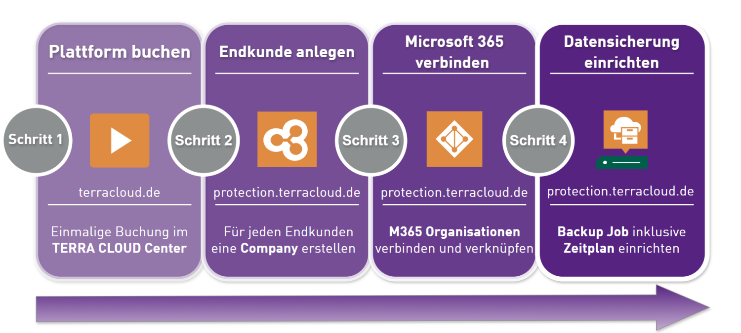 Die Einrichtung der Datensicherung besteht insgesamt aus vier Schritten, bei denen sich die Schritt 2-4 je Endkunde wiederholen.